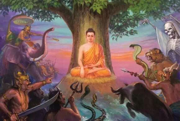 战胜天魔王的诸魔军(EON注:在偈中提到过十大魔军的名字—第1军:爱欲;第2军:不乐;第3军:饥渴;第4军:渴爱;第5军:昏沉;第6军:恐惧;第7军:怀疑;第8军:恶毒顽固;第9军:名闻利养;第10军:自赞贬他;那时还未成道,没有什么超凡能力,他以凡人之躯面对这些魔军时的态度是:‘我挥不退之战旗,我说惜命为可耻,宁可战死于沙场,不愿失败而苟活’;据说当时吃过乳粥之后,就扬手将钵盂弃在河中,意味着若不成道,这就是他吃的最后一餐(SN.3:2);经典里也记载有很多后来的 阿那罕 在证果之前,都有这种‘不成道宁可死’的心态和做法;雷迪长老 的著述里有提到这种心态实际上就是四神足之一:欲神足 的体现)