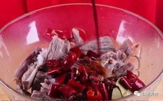 煮开之后将牛肉捞出装盘备用。注意需要将牛肉表面的泡泡洗干净。然后将干辣椒,盐,油,八角,糖,花椒,耗油,生抽,老抽,一小茶杯红酒是提味的。加入牛肉里面拌匀.