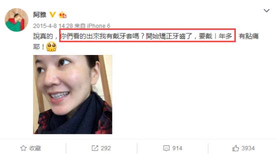 ◆3、阿雅:你看得出来我戴牙套吗?微博宣告开始戴隐形牙套矫正牙齿,要戴一年多~
