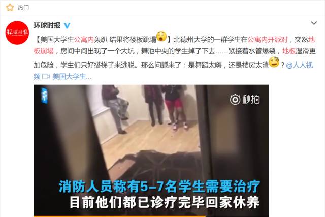 据环球时报报道,美国北德州大学的一群学生在公寓内开派对,突然木质地板崩塌,房间中间出现了一个大坑,,紧接着水管爆裂,地板湿滑更加危险,学生们只好搭梯子来逃脱……
