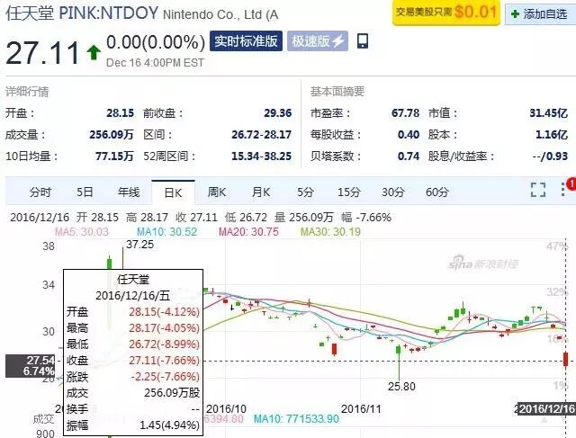 此外,火爆的游戏也没能刺激任天堂的股价。早在今年9月份,任天堂宣布马里奥将进入App Store应用店之时,任天堂美国存托股曾大涨28%。如今马里奥正式上线了,任天堂的股价却有点不给面子,其美国存托股周五一度下跌近9%,最终收跌7.66%。