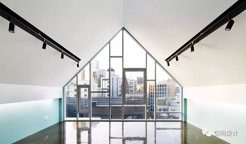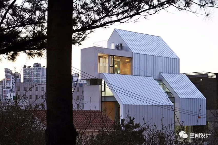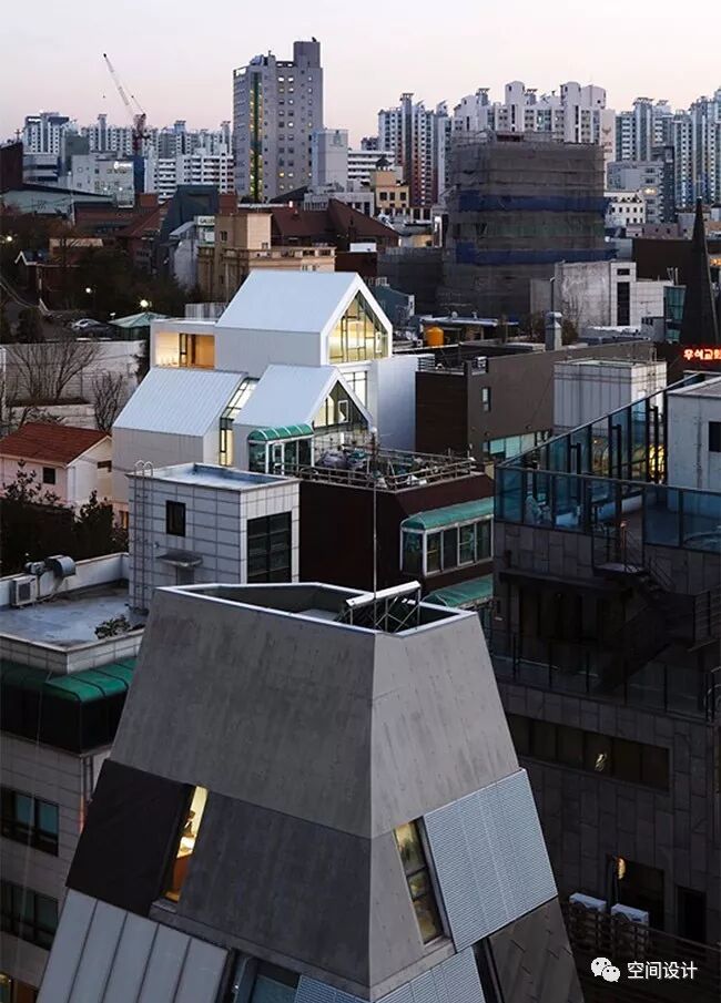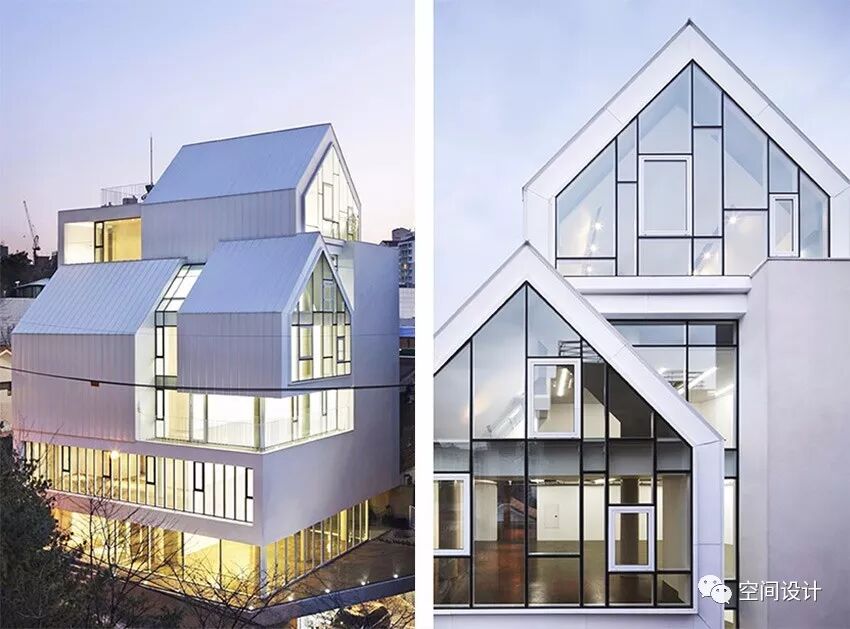 整栋建筑大量使用通透落地玻璃窗,方便欣赏江南的豪华夜景,黑色直线窗框映衬外墙线条,加重几何效果。外墙为镀锌钢板,装饰纯白Monocouche 防水砂浆,仿佛北欧小木屋般的造型清爽而充满诗意,因为外观独特,还曾获得「江南区厅建筑大赏」,三角形屋顶为清潭洞的天际线增色不少,成为江南豪宅中的一抹简约清流。