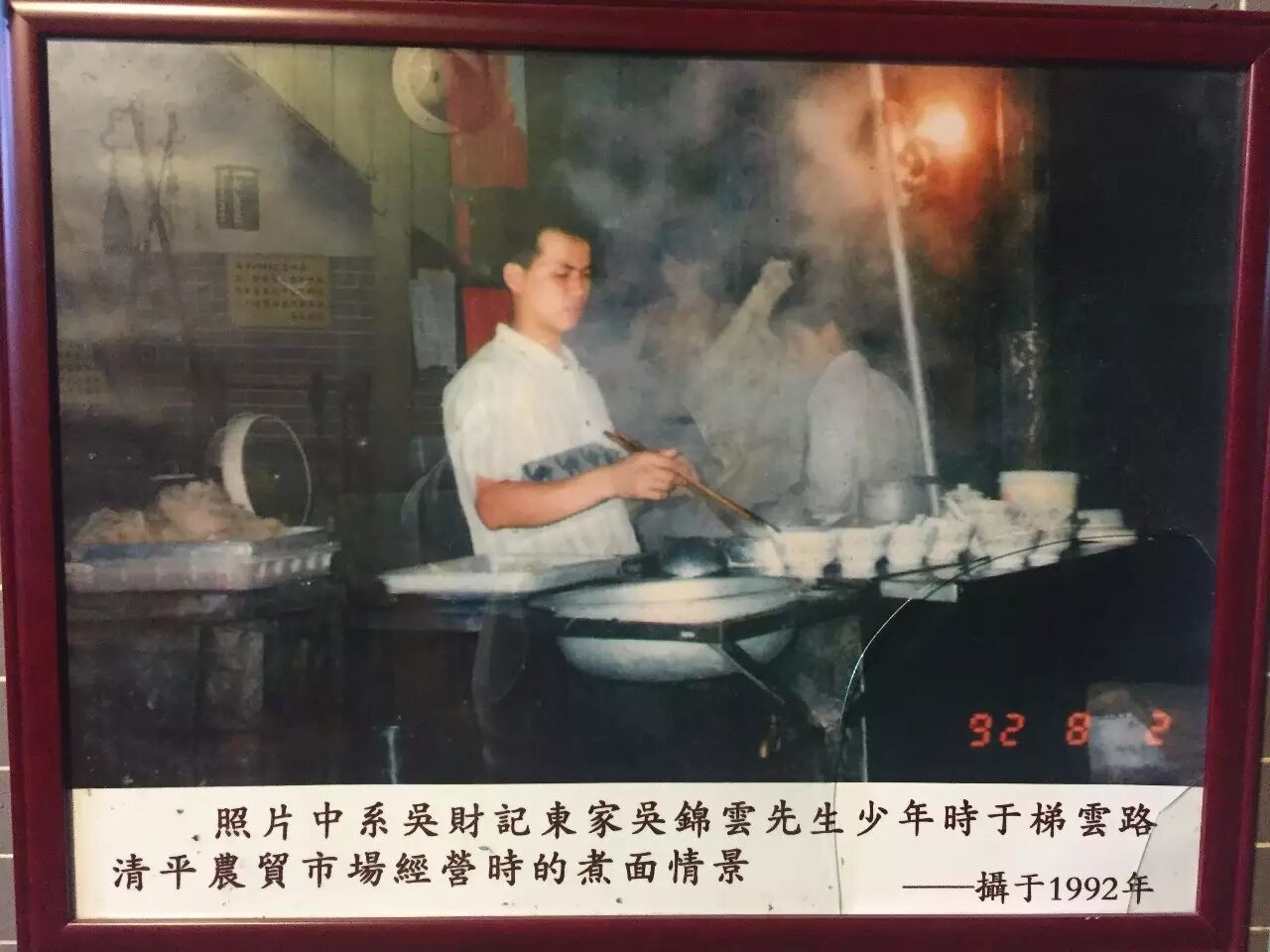 钱还在继续赚,而传统的人手竹升压面也逐渐升级为前文所提到过的机器竹升压面。到了八十年代末,吴财记命运的又一个转折点出现了——无数街坊投诉这些摊档占道经营。上图中还是少东家的云哥,也许是告别流动摊档之前最后的照片了。