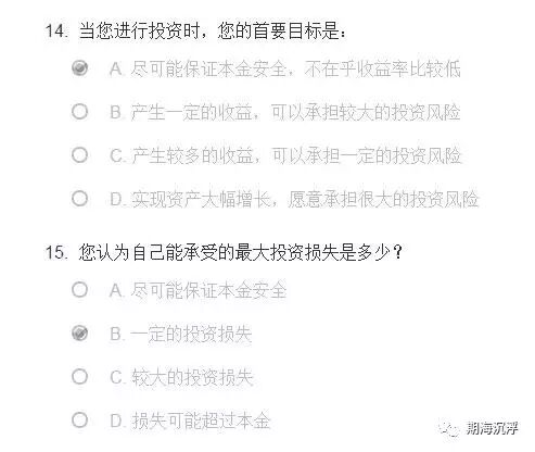 投资者适当性调查的时候第十四、十五题这2题千万不要选A,否则评分很低。