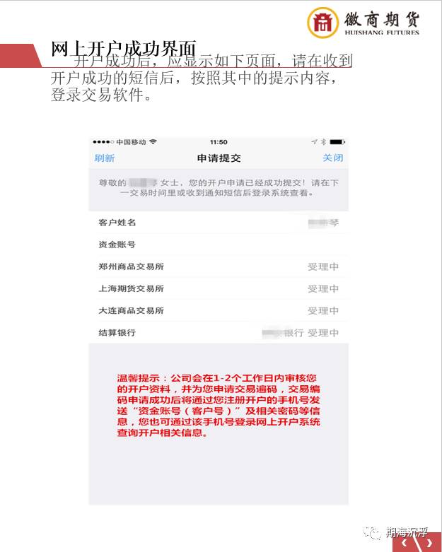 视频完成后,下载安装填写提交数字证书,在线回访后即可收到网上开户完成界面。等待一至俩个工作日后客户号会通过短信形式推送给您。