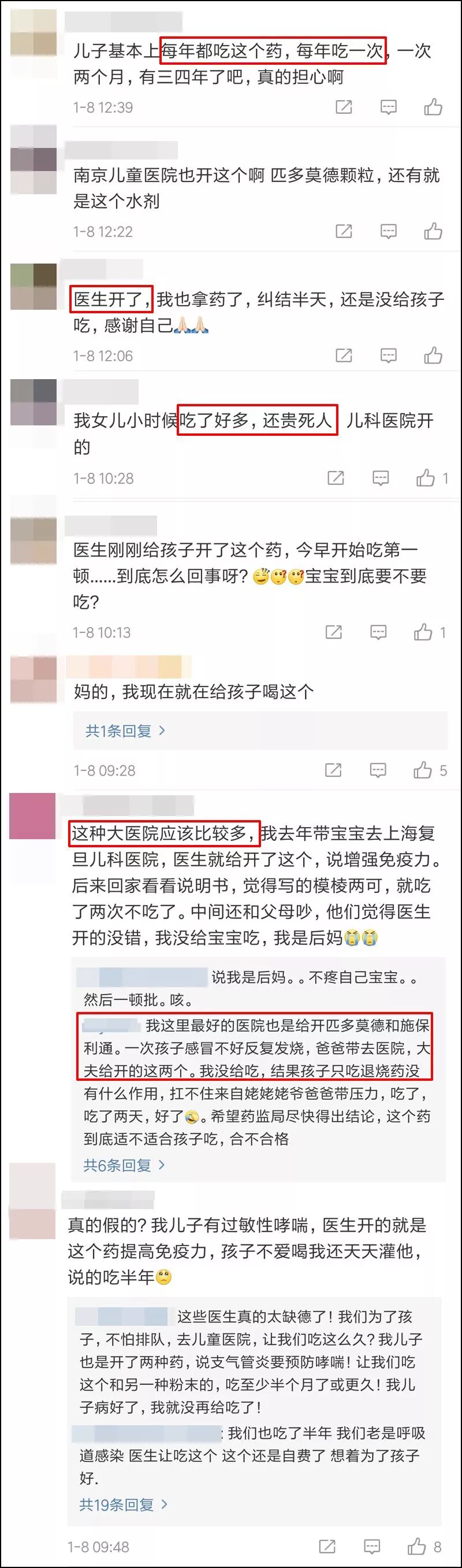 冀连梅发文章反映,在微信公众号里的网络咨询平台上,几乎每天都能看到关于匹多莫德口服液的咨询。粗粗浏览一遍,她才发现这个药是儿科、耳鼻喉科和皮肤科医生们的宠儿,从这三个科室看完病出来的孩子,几乎每人手里的药单上都有匹多莫德的身影,流水线一般:预防感冒来一盒、发烧咳嗽来一盒、鼻炎扁桃体炎来一盒、湿疹荨麻疹来一盒……每盒的单价从几十到上百元不等,而且一开就是一个月的量,一吃就是三个月的疗程,难怪医生们会对它推崇备至!