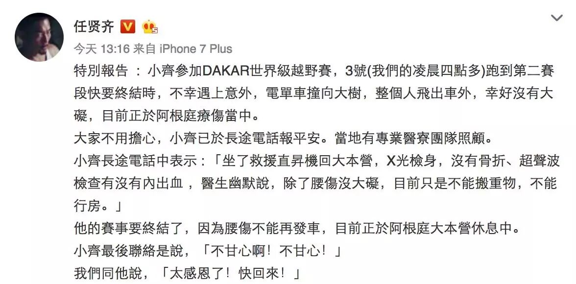 在达喀尔拉力赛第二赛段当中,中国摩托车手任贤齐在比赛中撞树受伤,最新的消息,任贤齐在赛段接近尾声时撞树,整个人飞出赛车,但并未骨折也没有内出血,只是腰部受伤。目前任贤齐正于阿根廷接受进一步治疗,他的2017年达喀尔征程就此止步。希望小齐哥早日康复,尽快回到他热爱的赛车当中。