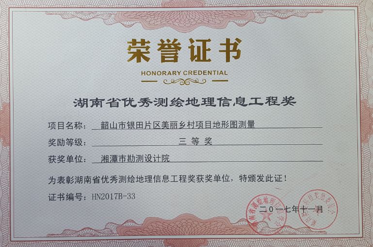2017年12月22日,湖南省测绘地理信息学会2017年学术年会在长沙召开。会议表彰了2017年湖南省测绘地理信息科技进步奖和优秀测绘地理信息工程奖获奖单位。其中,湘潭市勘测设计院“韶山市银田片区美丽乡村项目地形图测量”项目荣获湖南省优秀测绘地理信息工程奖三等奖。