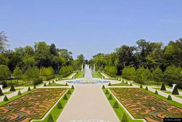 花园仿照国王路易十四的宫殿设计,摆放了大理石雕像,建有一个以金箔装饰的喷水池。