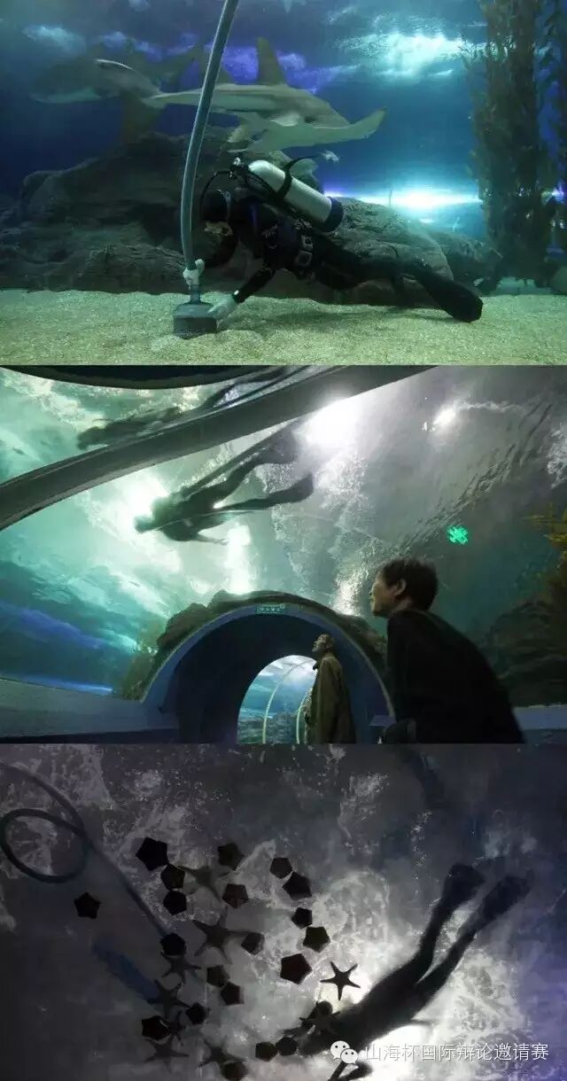 青岛海底世界,工作人员王春身着潜水服,在清理鱼缸和动物排泄物。在她身旁,鲨鱼等海洋生物游来游去。