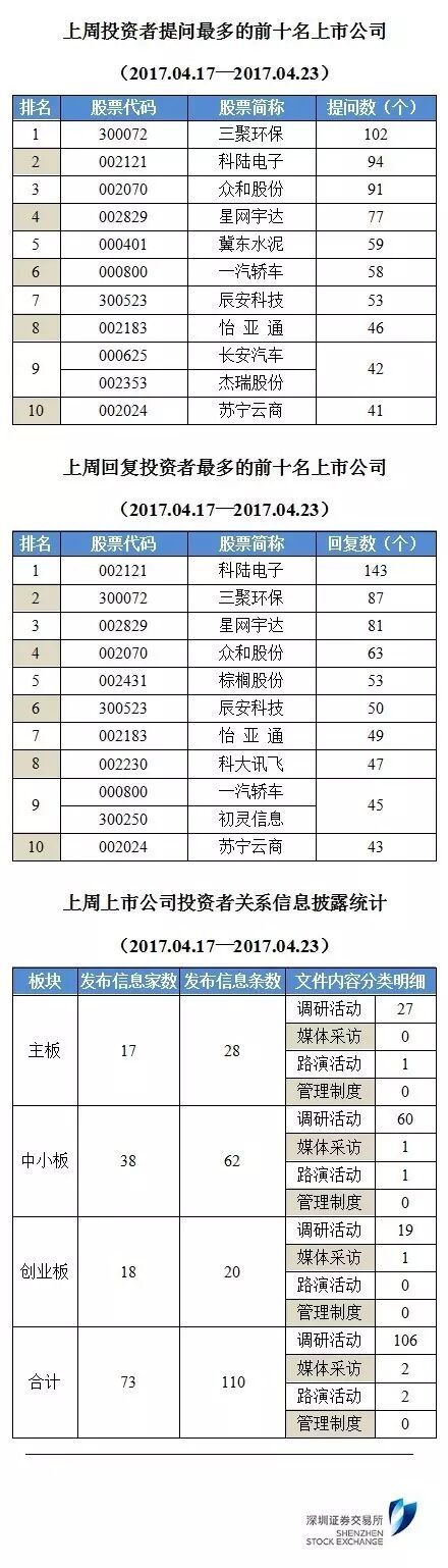 上周,我所互动易收到投资者日常问题共10938条,其中有效问题8371条,上市公司回复7763条(含本周对以往问题的回复);共有73家上市公司发布110条投资者关系活动记录文件。互动易APP目前已正式上线,进入以下网址可下载安装:苹果版http://t.cn/8sPr5SE,安卓版 http://t.cn/8sPrfIY。