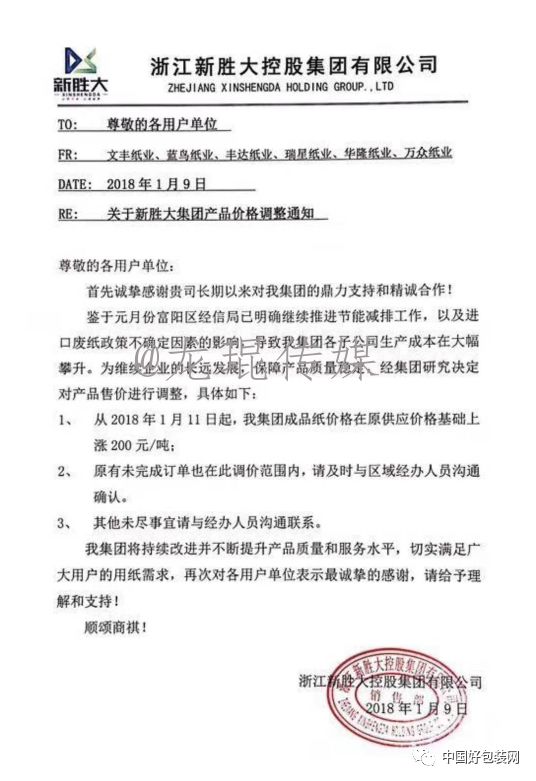 1、自2018年1月8日17:30起,所接纸板订单价格在现价格基础上上涨6%;