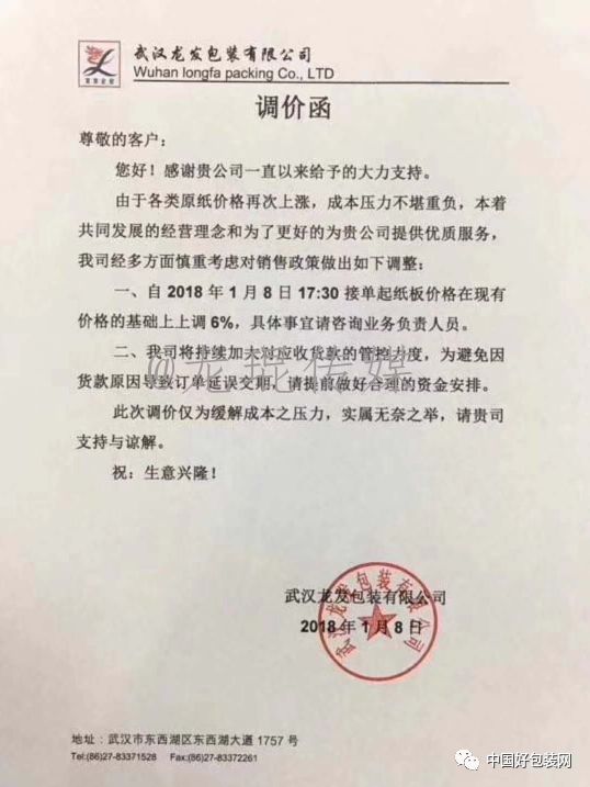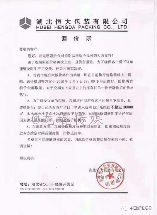 同时,华中、华东地区一大批纸板厂纷纷取消特价优惠,发布涨价函,宣布自2018年1月8日起,所接纸板订单价格在现价格基础上上涨6%。催账、控制下单量等措施也伴随而来。