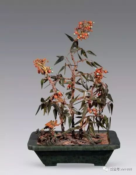 Lot 1129 清晚期 碧玉花盆嵌珊瑚、绿松石盆景