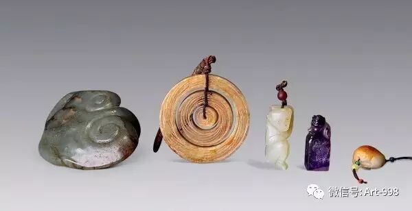 Lot 1261 清 青玉如意头、紫水晶印章、玛瑙猴、旧玉雕三环珮、留皮金蟾 (共五件)