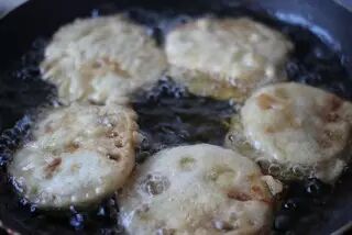5、锅置火上油烧至8成热,逐一放入藕盒中火炸至两面金黄,捞出即可。