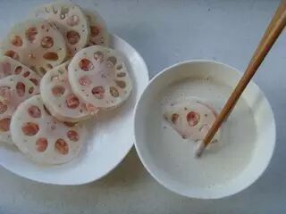 4、将藕合放入调好的鸡蛋糊蘸匀。