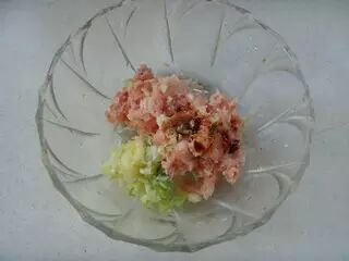 1、五花肉去皮剁成肉馅,调入葱末、姜末、生抽拌匀,分次加入清水顺同一方向搅至上劲。