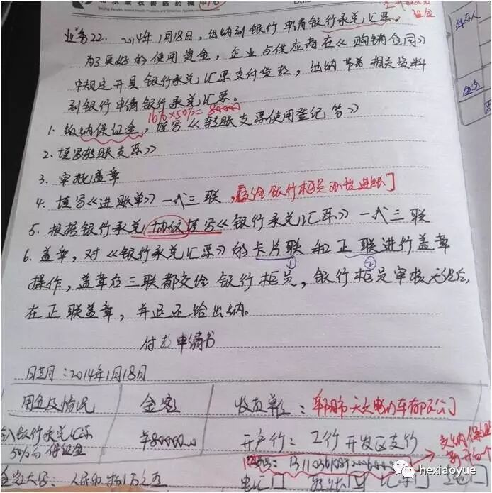 这位同学是通过看网络视频课程,记录下的一笔关于银行承兑汇票办理的业务笔记,依图片的笔记加上与她交流,最后我判断如下: