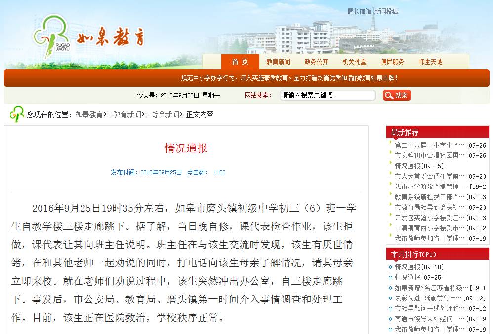 以下是如皋教育局官网的情况通报: