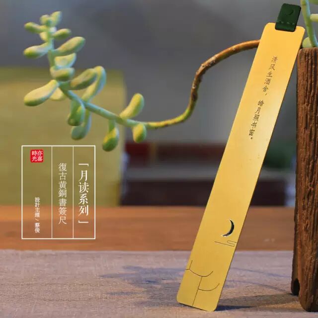 这枚小书签,是亦喜工作室的第一款小产品,我们称它为:「月读」系列复古黄铜书签尺。