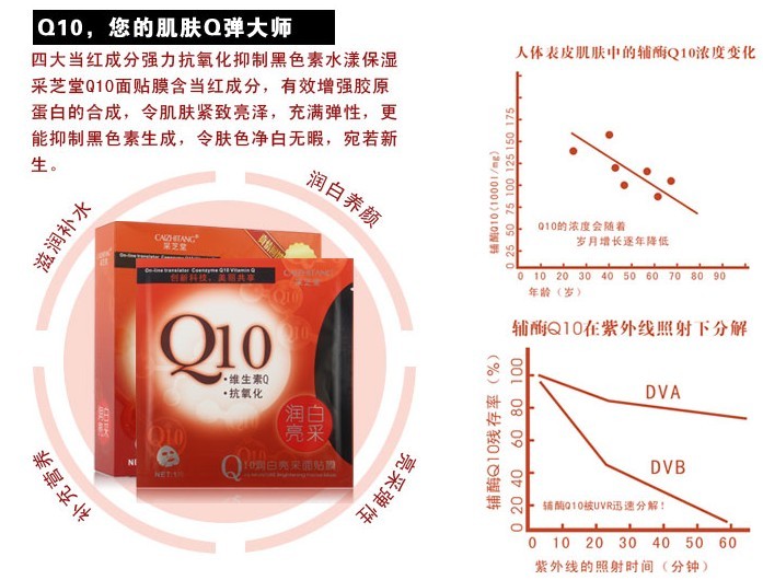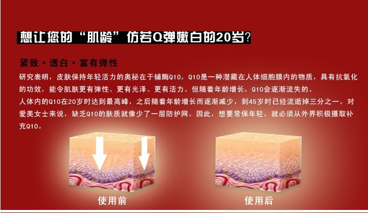 功效:Q10系列中的多酚是一种强力的抗氧化分子,能够抑制自由基对弹力纤维造成伤害,长时间肌肤就会缺乏弹性,当Q10中的多酚接触到肌肤后,即刻发挥活力作用,使暗陈、发黄,缺乏活力的肌肤充满弹性和健康光彩。