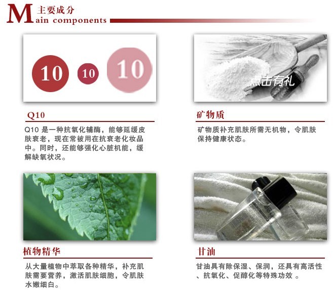成份:Q10 银杏叶提取物、熊果苷、胶原蛋白等