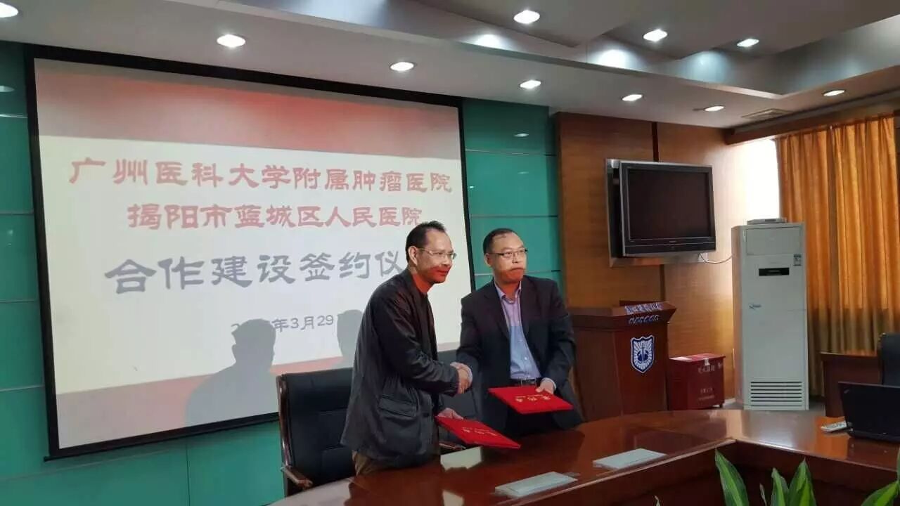 3月29日,院长林铁汉、副院长洪泽华、院长助理蔡泽贤、医务科主任袁细忠、肿瘤微创科副主任潘坤波一行5人到广州医科大学附属肿瘤医院签订合作协议。