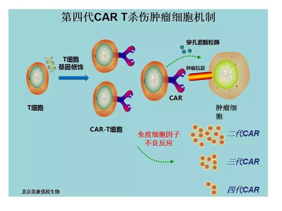 细胞因子释放综合征(CRS)是CAR-T治疗最常见的副作用,也是最令人担忧的安全因素。CRS的症状包括:高热、低血压和可逆的神经系统并发症,如神经错乱等。然而,4代CAR-T通过整合多个共刺激因子及基因,不仅在疗效上有较为明显的提升,更重要的是4代更加安全。在必要时候,可诱导启动基因,解除CRS 。