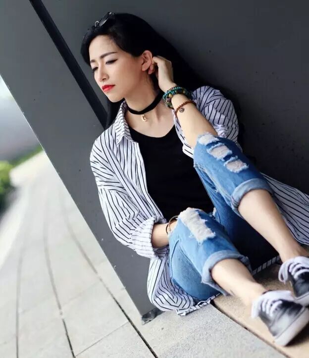下面搭配跟女主平时风格不同的破洞牛仔裤~