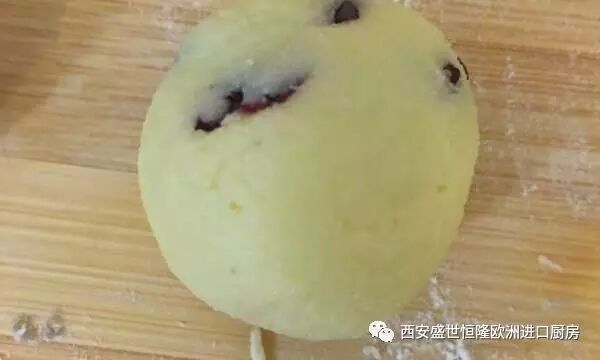 面团发酵的时候开始准备内馅。将黄油和糖粉用打蛋器打至软化,蛋液分三次加入黄油中,每次都要等到鸡蛋被吸收再加入下一次。最后加入淀粉、奶粉、切碎的蔓越莓混合成团且平均分成九份;
