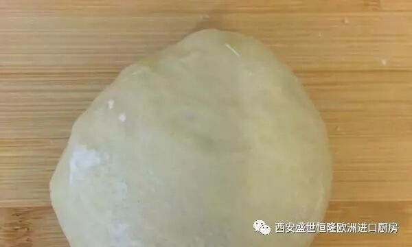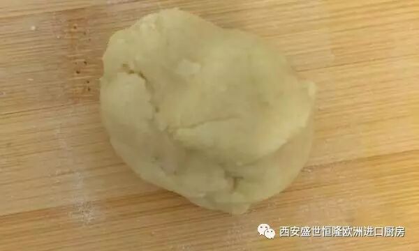 然后准备菠萝皮。同样是将黄油和糖粉打至软化,分3次加入蛋液;再将奶粉和一半的高筋面粉加入黄油拌匀;最后加入另一半高筋面粉,拌成柔软的面团,分成九份;