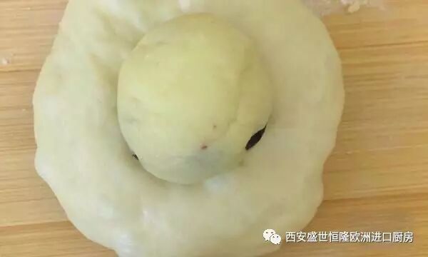 将包好的面团放于菠萝皮上,在手中转圈,将菠萝皮往上推;