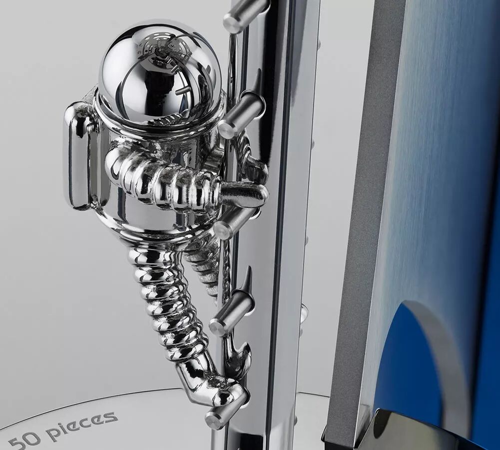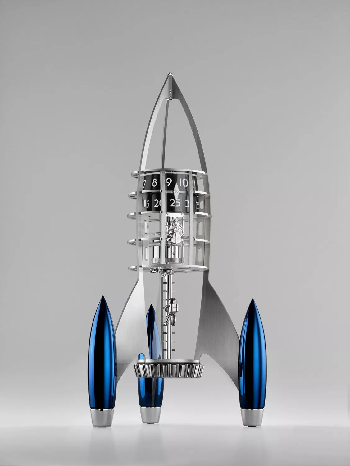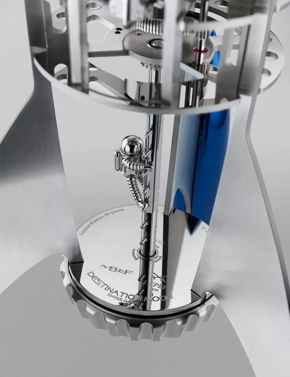 还有阿姆斯壮:这座令人不禁莞尔的玩偶模型,身着太空装,以坚实的银与不锈钢锻造,透过磁力吸附于连接表冠和机芯的阶梯上。阿姆斯壮是驾着Destination Moon飞向迷人异世界的太空人,更重要的是,他体现出人机一体的童年惊奇想望。