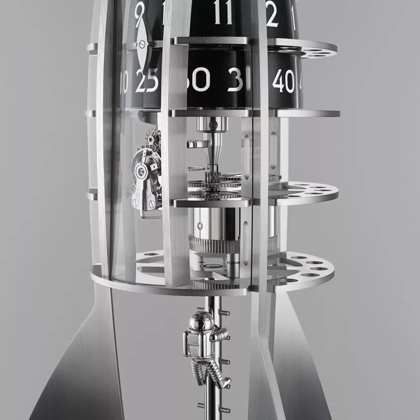 L’Epée’s 八日机芯以真实太空船的基本设计为构想概念,专为Destination Moon而打造。火箭的动力来自发射基座,而Destination Moon的动力则来自基座上的加大型上链表冠。火箭的管理与控制系统位在动力源上方,Destination Moon也一样,在时间显示的位置下方,垂直式调节器可精确校准时间,而机芯上方则有可设定时间的旋钮。调节器外观吸睛,具有生气十足的协调感,而以透明可见的矿石玻璃所制成的小型嵌板覆盖其上,则可让调节器免于宇宙辐射(以及好奇的手指头)的侵扰。