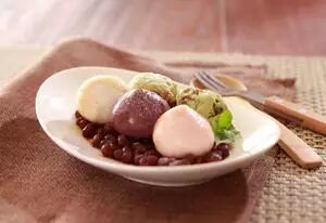 2.挖一碗冰激凌,将冷却的汤圆放在冰淇淋上;