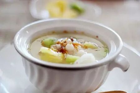 2、加入糯米小圆子后再次煮沸后,放入沥去水分的葡萄干。待小圆子漂浮上来的时候,加入水果煮1~2分钟左右。盛出水果小圆子,加入适量蜂蜜,撒少许桂花即可。