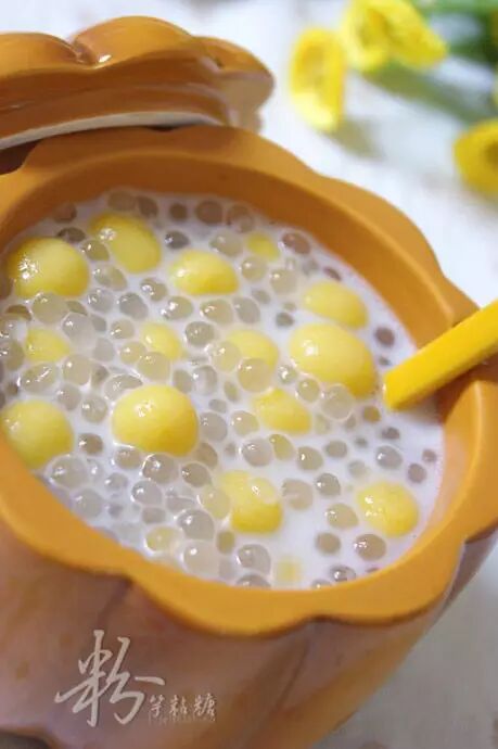 3、等西米煮至大半透明时,放汤圆,稍滚下,再加少许冷水,再滚,