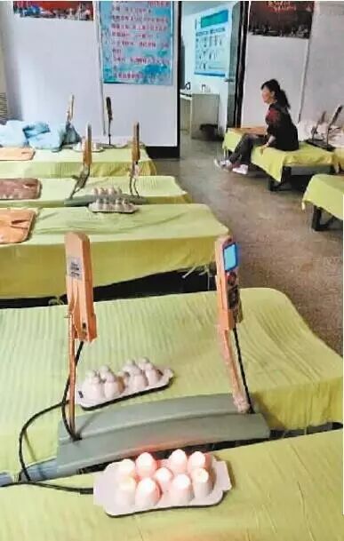 这是一套一百多平方米的房子,显得非常简陋。里边摆放着十几张类似行军床大小的床位,有两个工作人员正躺在上边,床位上几个固定在一起的小圆球正在闪光。