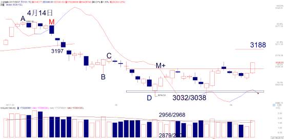 实际上,从行情的性质看依然是反弹走势,高度首先看3188,即上证指数自4月7日高点3295下跌至低点3016这一波的黄金分割率0.618,然后是3235,如果到达那么这波行情就成立了,将扭转颓废的势头,有望转向多头控制的格局。