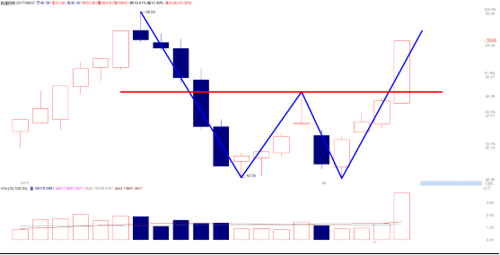 3、再一个是在此区域产生双重底,一个具有转折意义的强劲形态。